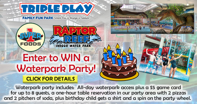 Each month one winner will be chosen to receive a Triple Play Raptor Reef Indoor Water Park Birthday Party and a birthday cake from Super 1 Foods in Hayden, ID!