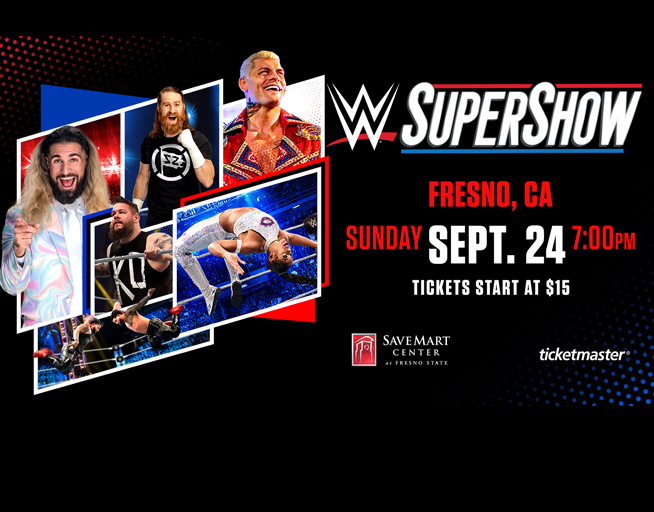 Prizes: Prizes for Sweepstakes include only those items expressly listed on the Sweepstakes Information Page for the corresponding Sweepstakes. Any other costs associated with the use or ownership of the prize is the sole responsibility of the winner. The Approximate Retail Value of each A pair of tickets to the WWE SuperShow at the Save Mart Center on Sunday, September 24th at 7:00 PM is 200.00. Winners, 3 to be selected, will be by a random drawing from among all eligible entries received during the Sweepstakes Period. Winners will be notified by email that the prize will be available to be Pick Up. In the event the winner cannot be reached within 14 days following attempted notification, or if the prize or prize notification is returned as unclaimed or undeliverable, the prize will be forfeited and an alternate winner may be selected. No substitution of any prizes except by Operator. No prize transfer permitted. No prizes will be refunded or exchanged for cash. If a prize is unavailable, Operator reserves the sole right to substitute a prize of equal or greater value. All taxes, fees, and surcharges on prizes are the sole responsibility of the winner. Operator will not ship any prizes to an address outside the United States.