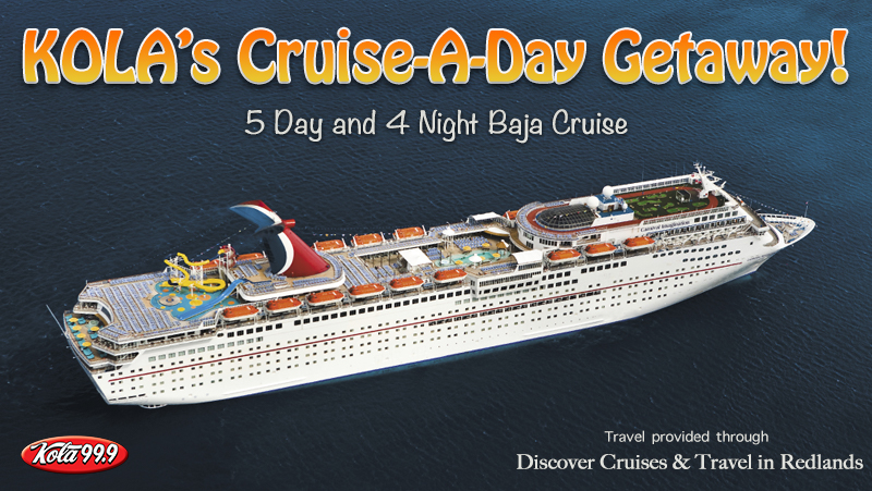 | Disclosure: | Prize cannot be redeemed for cash. The Prize is nontransferable. The cruise will be booked through Discover Cruise & Travel. The cruise will be a 4 night Baja cruise from Long Beach, CA, with stops in Catalina & Ensenada. Available sailing date(s) will be provided to winner by Discover Cruises & Travel. Winner may choose an alternative sailing date, for an additional fee, if the date(s) given does not fit with their schedule. Winner is responsible for any onboard expenditures including gratuities. Winner must redeem cruise through Discover Cruises & Travel by September 30, 2018. Winner must be at least 21 years of age. Travel to and from port, and costs associated with transportation and any additional costs such as parking fees is the complete responsibility of the winner. Winner must have proper identification to travel, a valid U.S. Passport or at minimum, drivers license and birth certificate. KOLA 99.9 or Discover Cruises & Travel are not responsible for denial of boarding due to improper ID. |