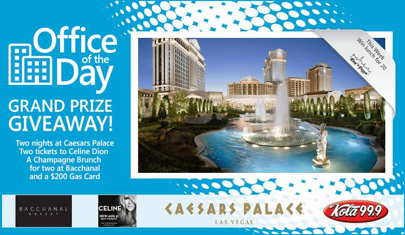 Friday 6/6/2014 – Friday 6/13/2014 all listeners will be encouraged enter to be the Office of the Day. The qualifying office will randomly be selected from all entries during that week’s prize. Each weekday during the promotion at varying times KOLA will announce a new qualifier and their office. One qualifier per day Monday – Friday. The qualifying office will be entered to win lunch for 20 from the Restaurant Prize and the Las Vegas Prize. Then, on Friday June 13th, 2014 the winning office will be selected from all previously qualified offices during that week. Each time the prize changes offices will need to re-enter the contest to be considered for the prize. |