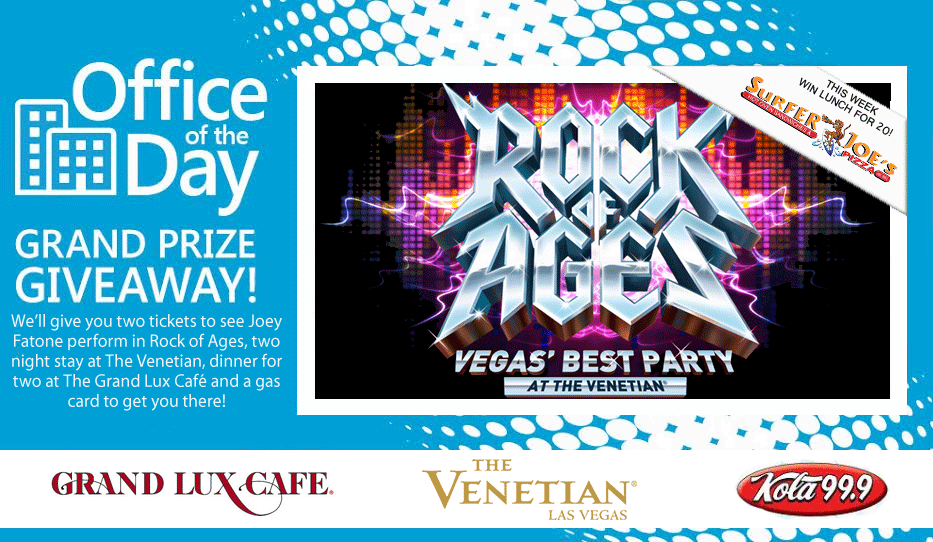 Friday 2/20/2015- Friday 2/27/2015 all listeners will be encouraged enter to be the Office of the Day. The qualifying office will randomly be selected from all entries during that week’s prize. Each weekday during the promotion at varying times KOLA will announce a new qualifier and their office. One qualifier per day Monday – Friday. The qualifying office will be entered to win lunch for 20 from Surfer Joe's Hot Oven Sandwiches & Pizza plus 2 tickets to see Joey Fatone perform in Rock of Ages, 2 night stay at The Venetian, Dinner for two at The Grand Lux Cafe and a $100 gas card. . Then, on Friday, February 27th, 2015 the winning office will be selected from all previously qualified offices during that week. Each time the prize changes offices will need to re-enter the contest to be considered for the prize.
