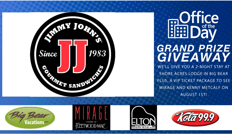Friday 7/17/2015 at 5:00PM - Friday 7/24/2015 at 9:00AM all listeners will be encouraged enter to be the Office of the Day. The qualifying office will randomly be selected from all entries during that week’s prize. Each weekday during the promotion at varying times KOLA will announce a new qualifier and their office. One qualifier per day Monday – Friday. The qualifying office will be entered to win lunch for 20 from Lunch for 20 at Jimmy John's Gourmet Sandwiches. Plus, a 2-night stay on 7/31-8/2, at Shore Acres Lodge in Big Bear and VIP ticket package for 6 adults to Music In the Mountains on August 1st at Big Bear Discovery Center AmphitheaterThen, on Friday, July 24th, 2015 the winning office will be selected from all previously qualified offices during that week. Each time the prize changes offices will need to re-enter the contest to be considered for the prize.