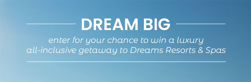 (i)Accommodations are valid for the lead in room category and may vary based upon resort selection. Accommodations are valid for one room, double occupancy and include all meals and alcoholic and non-alcoholic beverages that are available as part of the standard all-inclusive package. Additional room charges, spa services, telephone calls, incidentals and all additional expenses are not included.Giveaway is only valid for Dreams Resorts based in Mexico, the Caribbean and Central America. The giveaway is not applicable to any resorts outside of these regions.