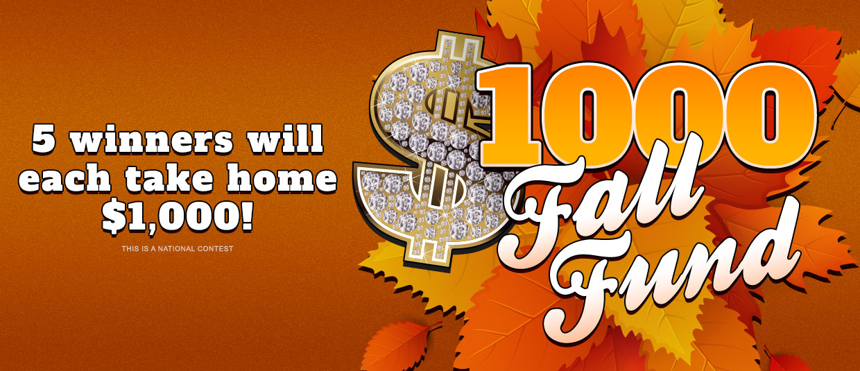 It’s the most wonderful time of the year! No, not Christmas... FALL! We want to help you make the most of this season with the $1,000 Fall Fund! You could spend it on football tickets and a full tailgate, or to fund your daily pumpkin spice latte habit. Maybe you'd want to use it for a fabulous Fall foliage getaway, or maybe you just want to make your house the most festive on the block. We'll pick FIVE winners to each take home $1,000 bucks - to spend on whatever your idea of fun is this Fall! Just enter this national contest below for your chance to win the $1,000 Fall Fund!
