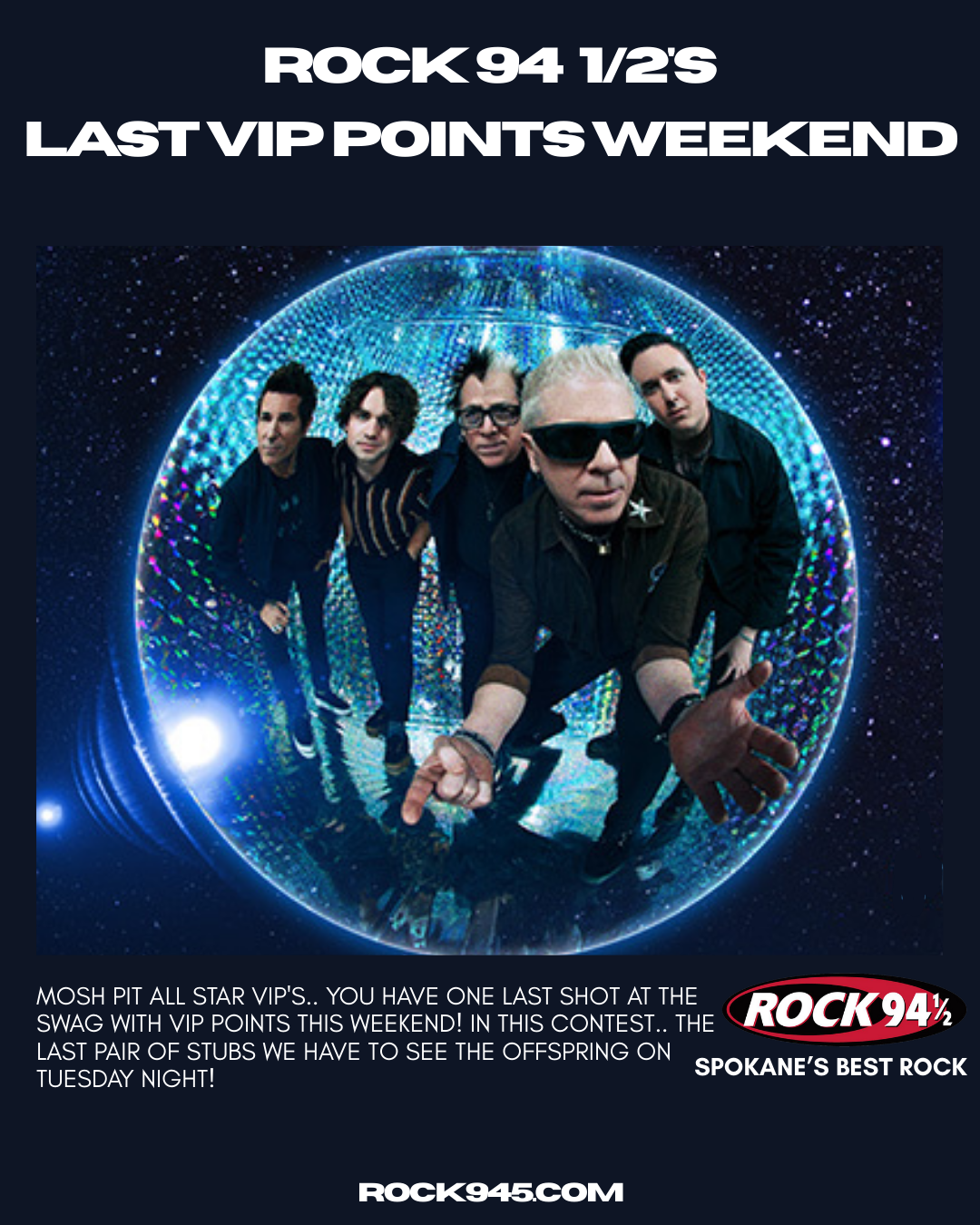 1.Contest begins 3PM on January 16, 2026 and ends 11:59PM on January 19, 2026. Listeners are invited to enter online through the Mosh Pit All Stars VIP program (http://vip.rock945.com) during the contest period. Listeners must spend points to be considered for one entry. (1) One winner will be chosen from the entries received. (1) One winner will receive one (1) pair of tickets to The Offspring, Tuesday January 20, 2026 at Spokane Arena. This prize is valued at approximately $102. All entries must be received by 11:59PM on January 19, 2026. The drawing will take place at KXLY Broadcast Group (500 W. Boone Ave. Spokane, WA 99201) on January 20, 2026, following the conclusion of the contest period. Winner does not need to be present at the time of the drawing to win. The odds of winning depend on the total number of entries.