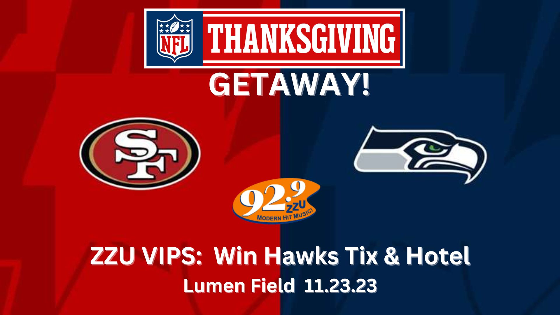 1. Contest begins November 8, 2023 at 6AM and ends November 17, 2023 at 10AM. Contestants are invited to enter through the 92.9 ZZU VIP Program (vip.929zzu.com) once per day for free and 2,500 points per additional entry. One (1) winner will be chosen from the entries received. Winner will receive a pair of tickets to see the Seattle Seahawks vs. the San Francisco 49ers on Thursday, November 23, 2023 at Lumen Field in Seattle, WA, plus a one-night hotel stay, the night of November 23, 2023. This prize is valued at approximately $550. All entries must be received by 10AM on November 17, 2023. The drawing will take place on November 17, 2023 following the conclusion of contest. Winner does not need to be present at the time of the drawing to win. The odds of winning depend on the total number of entries. In support of Warner Music Group.