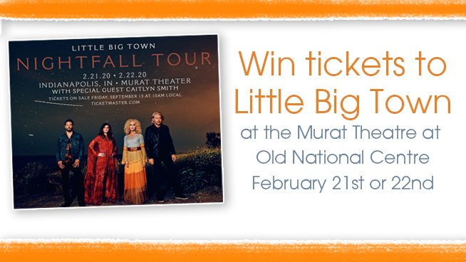 Prizes: Prizes for Sweepstakes include only those items expressly listed on the Sweepstakes Information Page for the corresponding Sweepstakes. Any other costs associated with the use or ownership of the prize is the sole responsibility of the winner. The Approximate Retail Value of each Tickets to see Little Big Town to the Murat Theatre at Old National Centre either Feb. 21st or 22nd is 70.00. Winners, 1 to be selected, will be by a random drawing from among all eligible entries received during the Sweepstakes Period. Winners will be notified by email that the prize will be available to be Pick Up. In the event the winner cannot be reached within 14 days following attempted notification, or if the prize or prize notification is returned as unclaimed or undeliverable, the prize will be forfeited and an alternate winner may be selected. No substitution of any prizes except by Operator. No prize transfer permitted. No prizes will be refunded or exchanged for cash. If a prize is unavailable, Operator reserves the sole right to substitute a prize of equal or greater value. All taxes, fees, and surcharges on prizes are the sole responsibility of the winner. Operator will not ship any prizes to an address outside the United States.